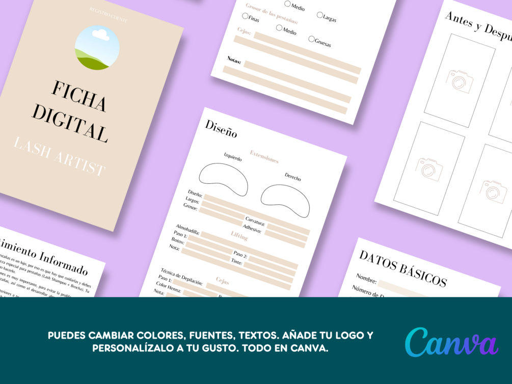 Imagina poder destacar la identidad de tu estudio de belleza con cada ficha que entregues, ¡será como llevar tu marca en cada detalle! Además, al ser editables, te brindan la flexibilidad para ajustarlas según las últimas tendencias o cambios en tus servicios.